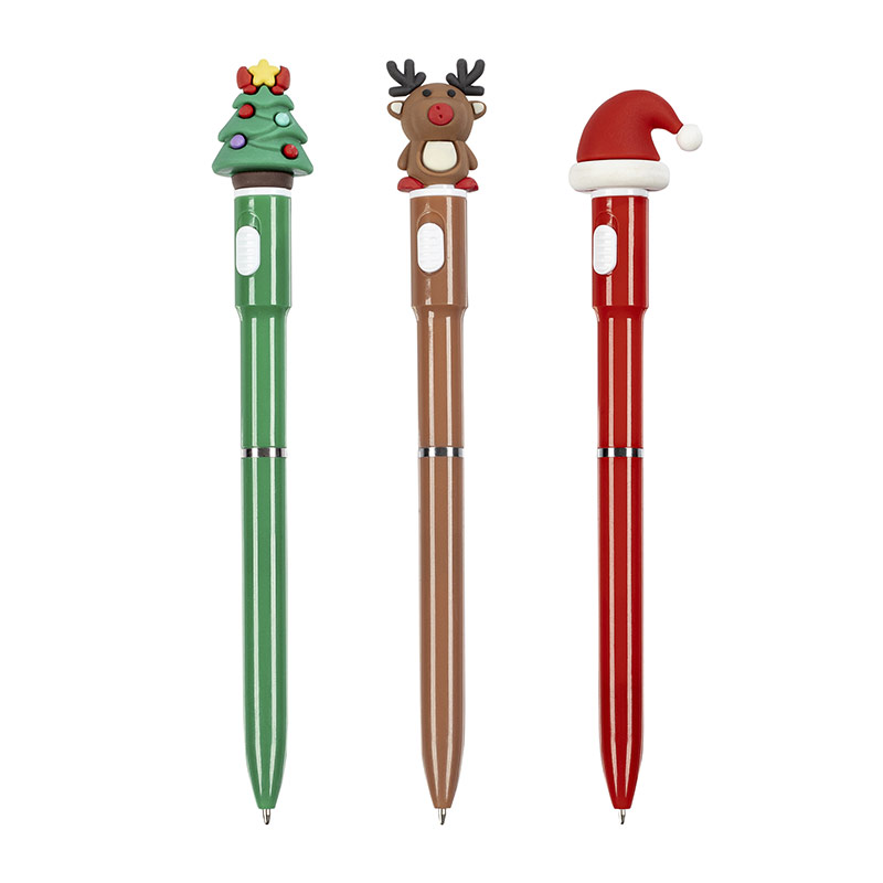 - Stylos à bille lumineux, ornés d’un petit personnage (bonnet rouge, renne ou sapin),