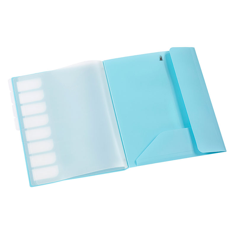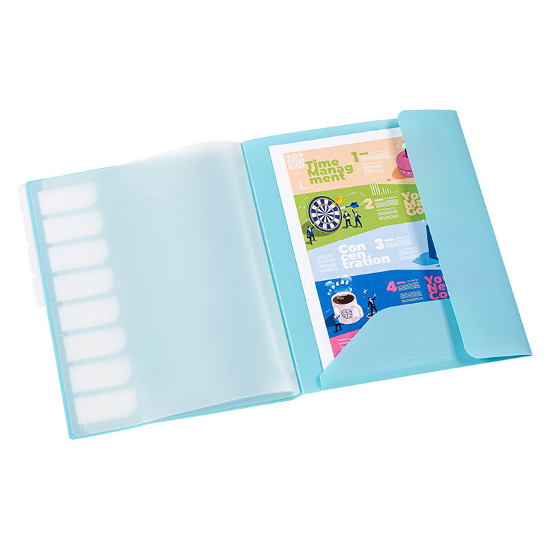 Les 8 compartiments, le grand porte-étiquette avec numérotation ainsi que les 2 rabats en 3ème de couverture facilitent le classement de vos documents A4.
