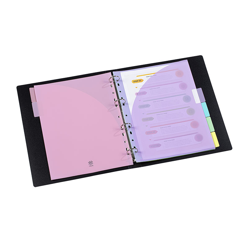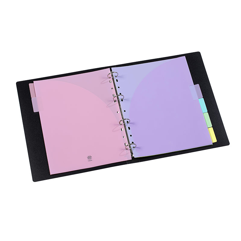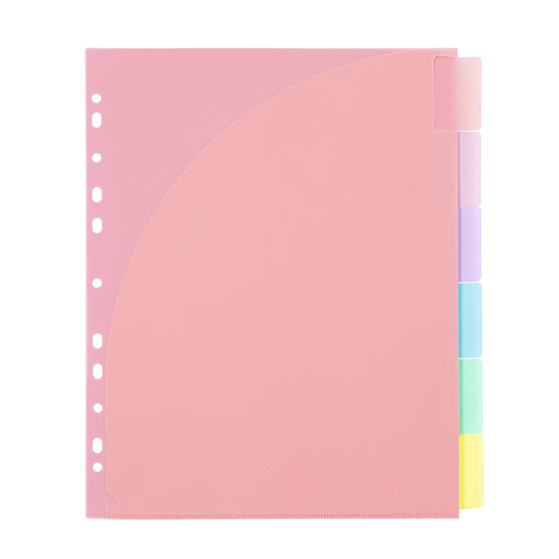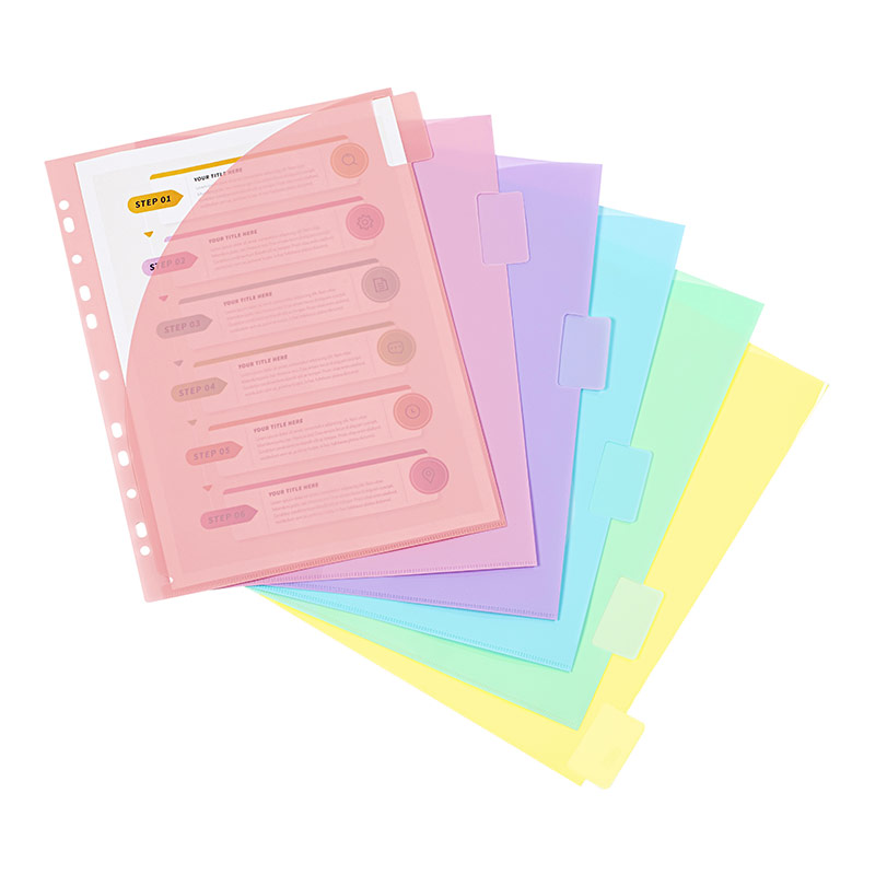 Ces intercalaires pochettes Rainbow Pastel ont une double fonction : ce sont à la fois des pochettes coins et des intercalaires avec 6 onglets perforés en plastique souple, résistant et multicolore pastel.
