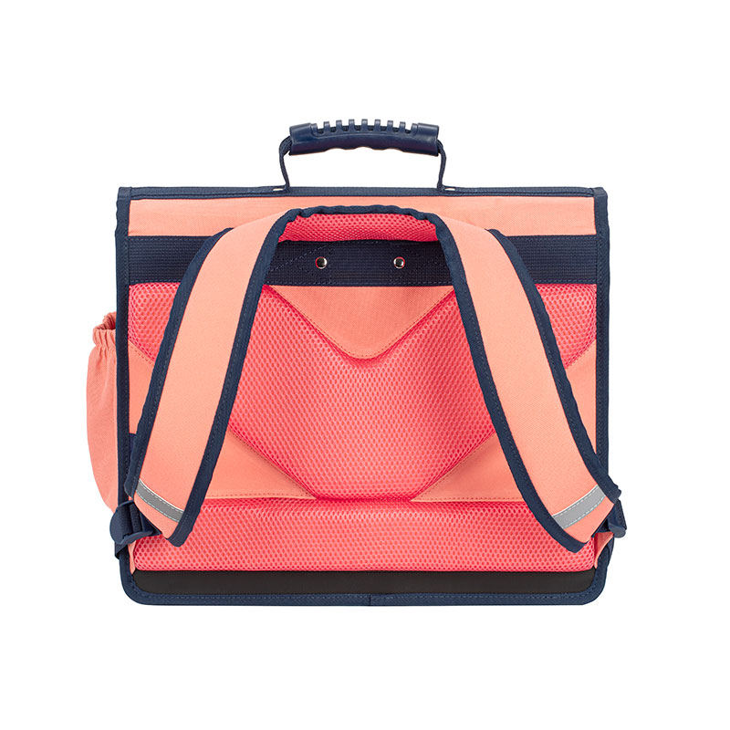 Ce cartable mesure 38 x 32 x 15 cm et est en matière polyester 600 deniers corail.
