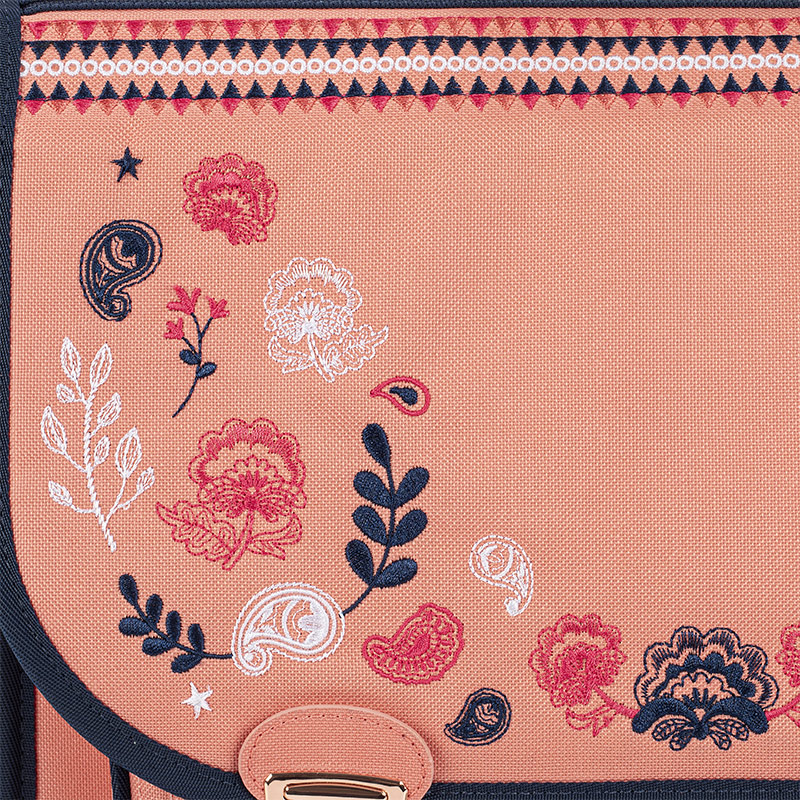 Le rabat du cartable est décoré de broderies aux motifs floraux dans un esprit bohème, soulignées par un biais bleu marine pour une finition élégante et délicate.