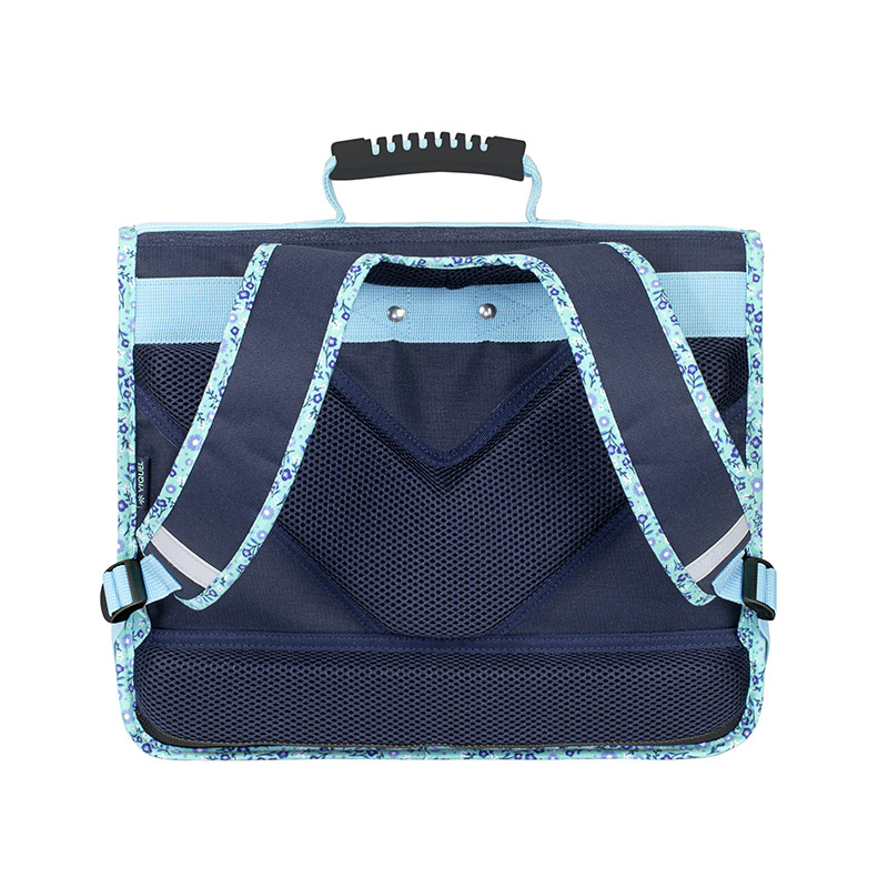 La poignée du cartable est en sangle bleue avec un renfort en tube caoutchouc noir pour un confort optimal.