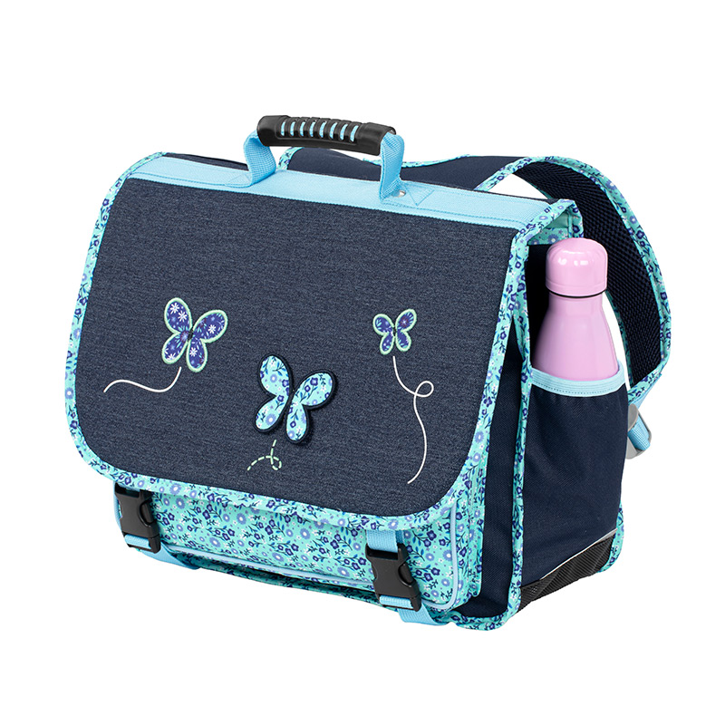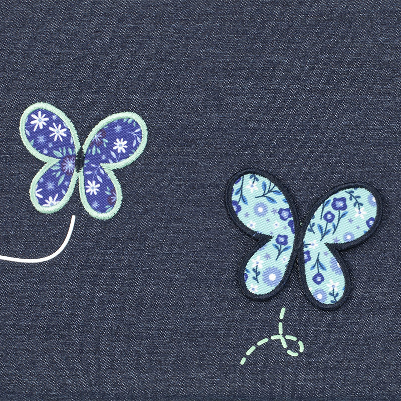 Le rabat du cartable est réalisé en denim stone et décoré de patchs brodés représentant des papillons, associés à une impression en sérigraphie et soulignés par un biais imprimé pour une finition délicate et élégante.