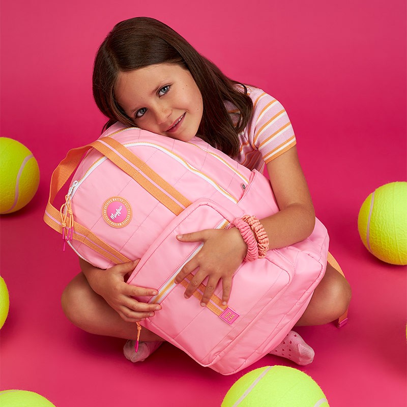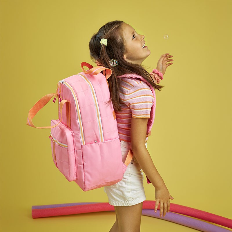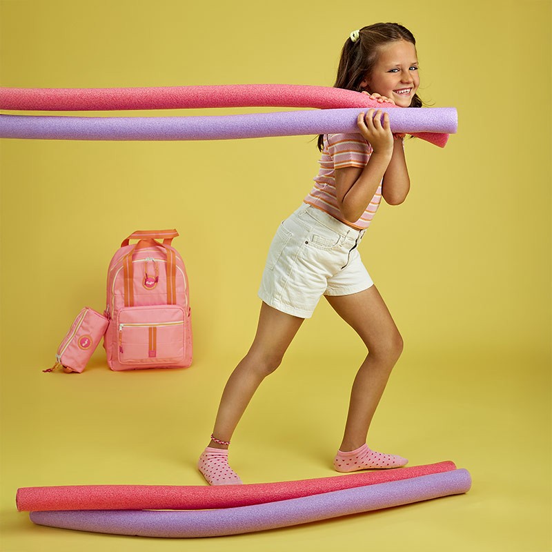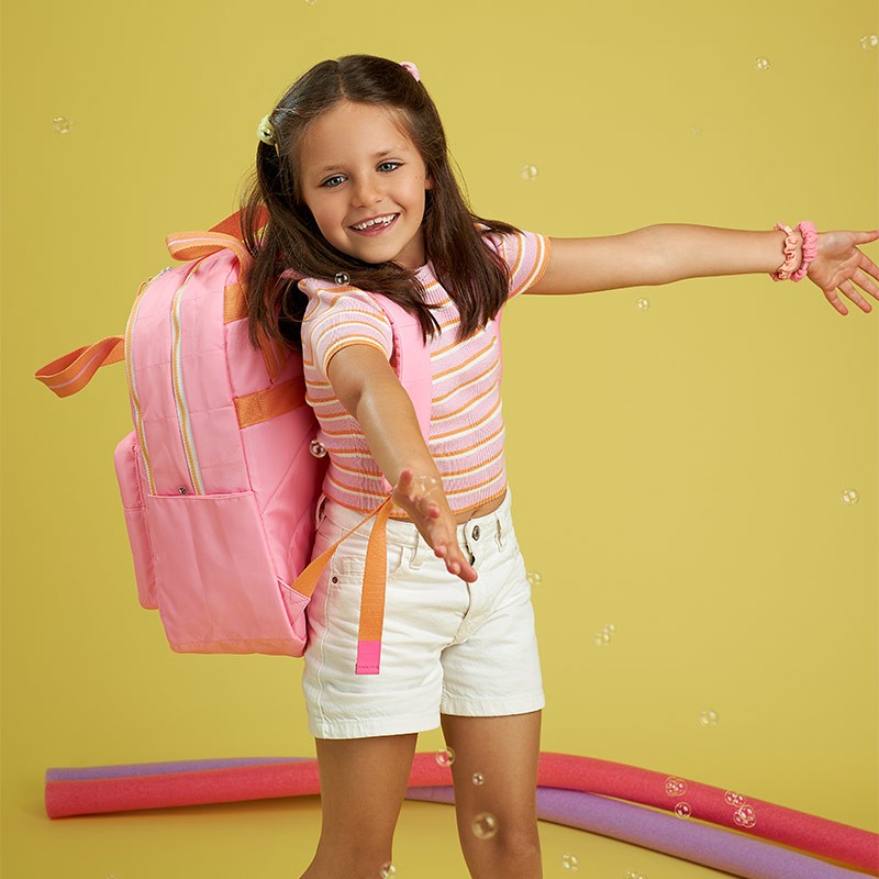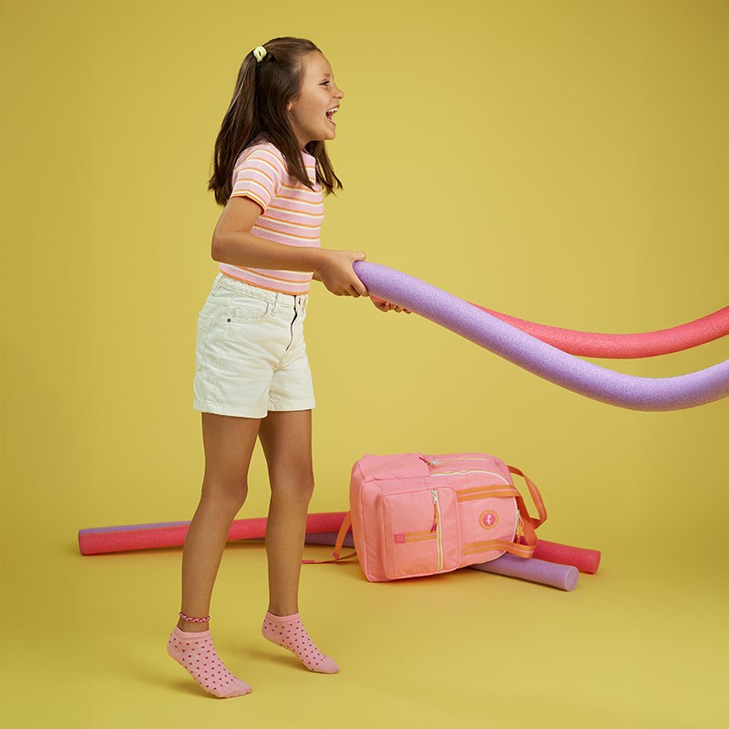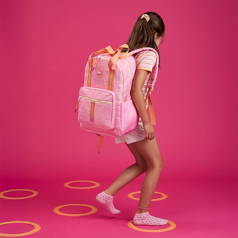 Il y a une poche avant en polyester rose pastel, agrémentée de sangles bicolores orange et rose.