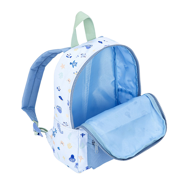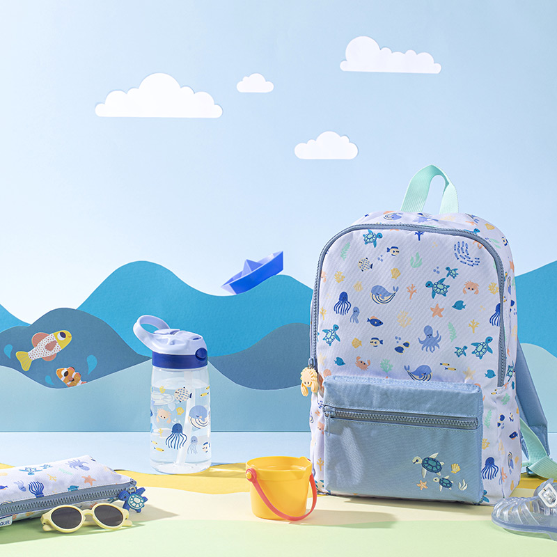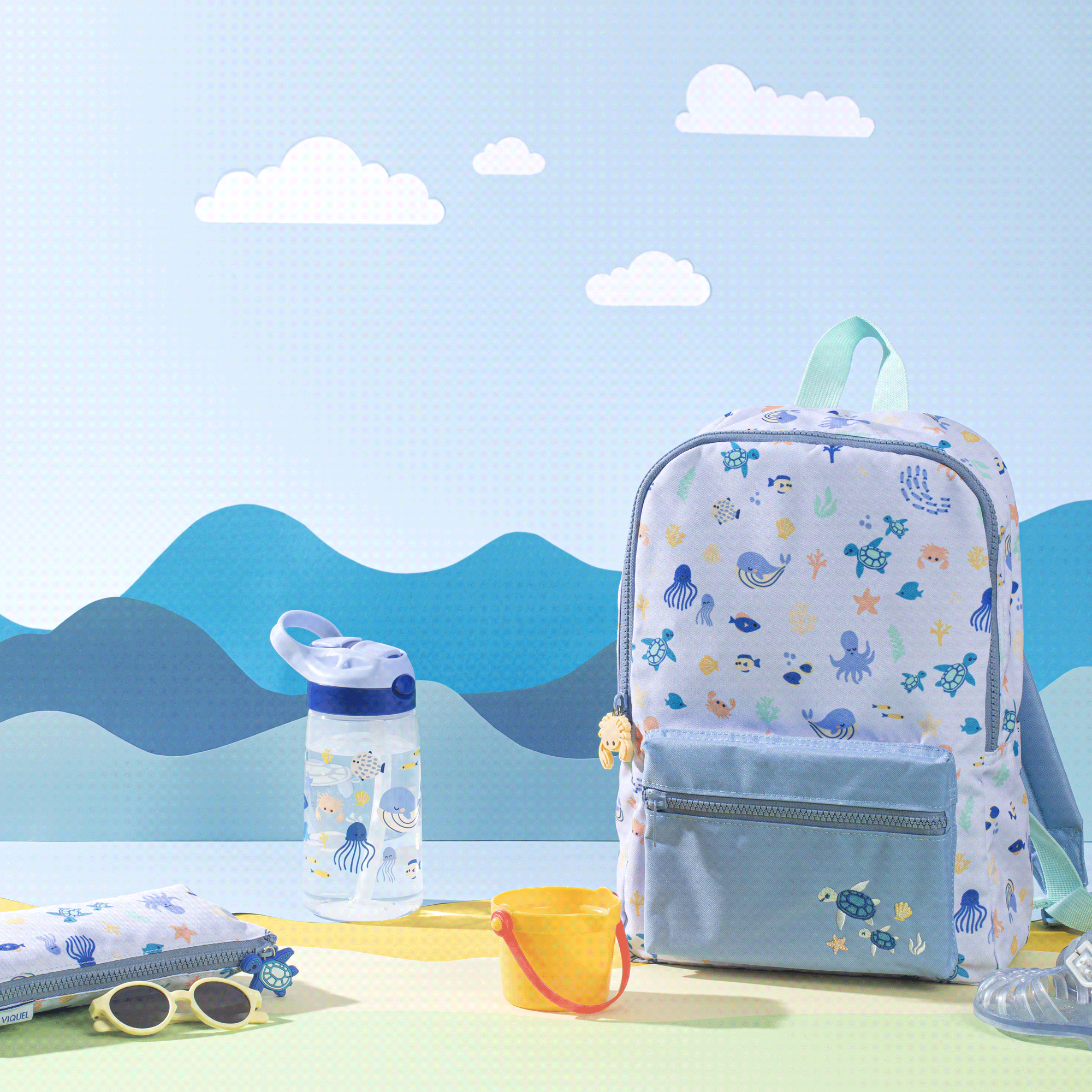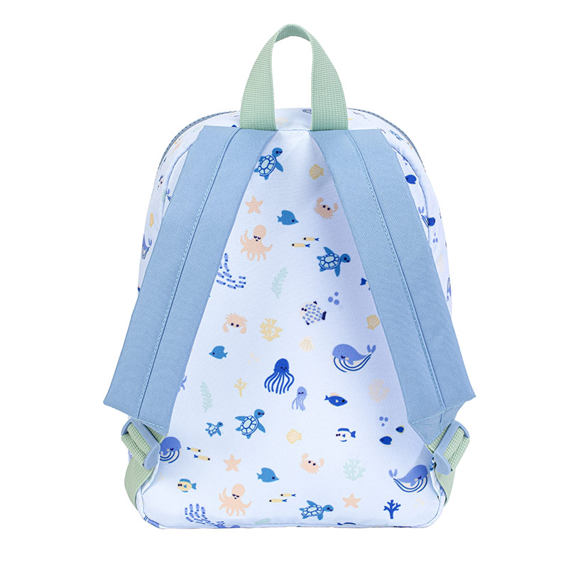 Le sac est décoré d’une impression allover en sublimation sur le thème de l’océan, apportant un univers ludique et coloré.