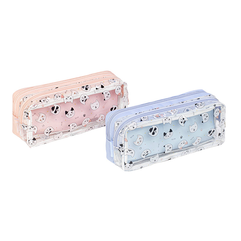 La trousse MIAOU est de forme rectangulaire et possède deux compartiments bimatière, un en polyester et l’autre en PVC, avec des zips roses ou bleus.