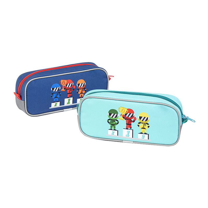 Une piste de courses est imprimée sur le devant et un podium est imprimé sur la face arrière. Les pipings sont réfléchissants et le dessous de la trousse est gris. Des languettes en polyester sont cousues au début et à la fin des zips.