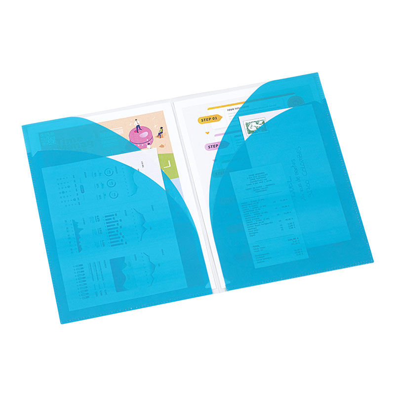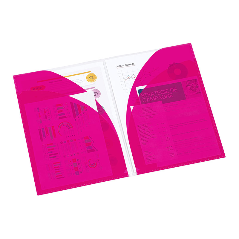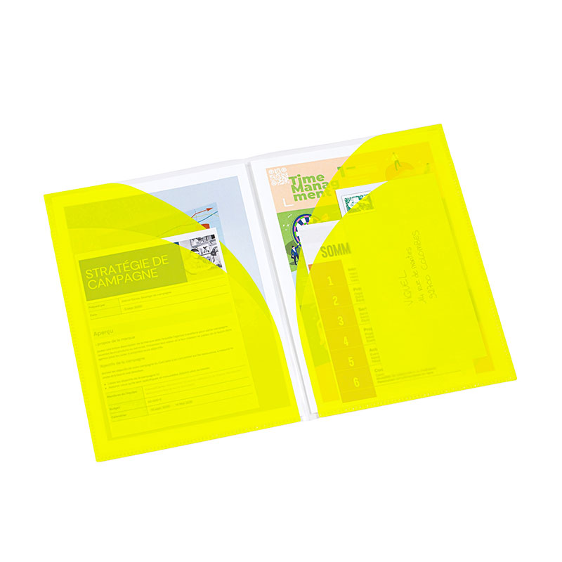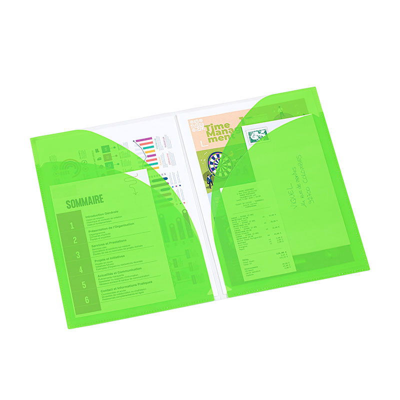 Cette pochette coin en plastique possède 2 volets colorés de chaque côté de la pochette transparente lorsque celle-ci est ouverte, ce qui correspond donc à 4 compartiments qui sont parfaitement adaptés au classement des documents de format A4.